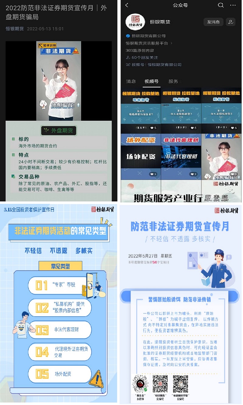 線下活動進(jìn)行的同時(shí),恒銀期貨公眾號、視頻號也在推進(jìn)反詐防非的內(nèi)容宣傳,通過圖文講解、短視頻、宣傳海報(bào)等多種方式傳播知識,增強(qiáng)投資者反詐意識。