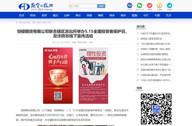2022年5月為第三屆全國防范非法證券期貨宣傳月,本屆防非宣傳月的主題為“選擇合法機(jī)構(gòu),遠(yuǎn)離非法主體,堅(jiān)持理性投資,謹(jǐn)防上當(dāng)受騙”。為進(jìn)一步加大防范非法證券期貨宣傳力度,提示非法證券期貨活動風(fēng)險(xiǎn),增強(qiáng)人民群眾對非法證券期貨活動的防范意識和能力,恒銀期貨有限公司(以下簡稱“恒銀期貨”)在河北證監(jiān)局、河北省證券期貨業(yè)協(xié)會的指導(dǎo)下,組織了“五個走進(jìn)”系列活動,走進(jìn)了校園、社區(qū)、企業(yè)進(jìn)行了系列反詐防非活動,并以此為契機(jī)宣傳期貨相關(guān)知識,發(fā)揮期貨公司服務(wù)實(shí)體經(jīng)濟(jì)發(fā)展的專業(yè)價(jià)值。