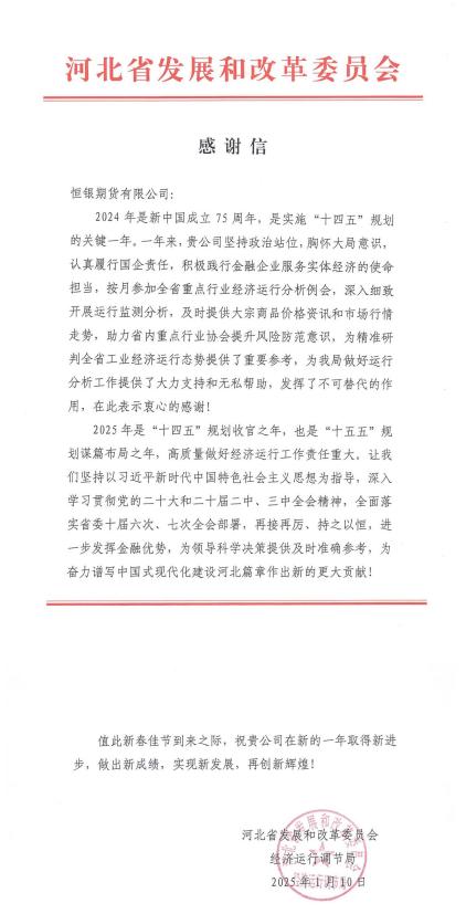 河北省發(fā)展和改革委員會(huì)經(jīng)濟(jì)運(yùn)行調(diào)節(jié)局向恒銀期貨發(fā)來(lái)感謝信